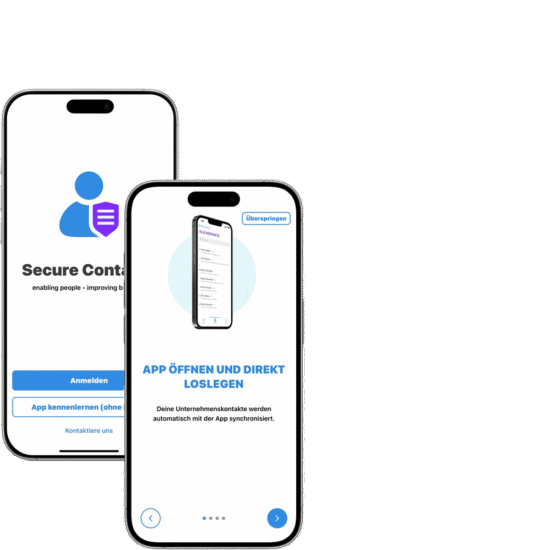 The Secure Contacts app enables GDPR-compliant management of business contacts on a smartphone. Thanks to automated data maintenance, there is no need to manually enter new contacts, duplicate contacts are consolidated, and data is consistently updated.